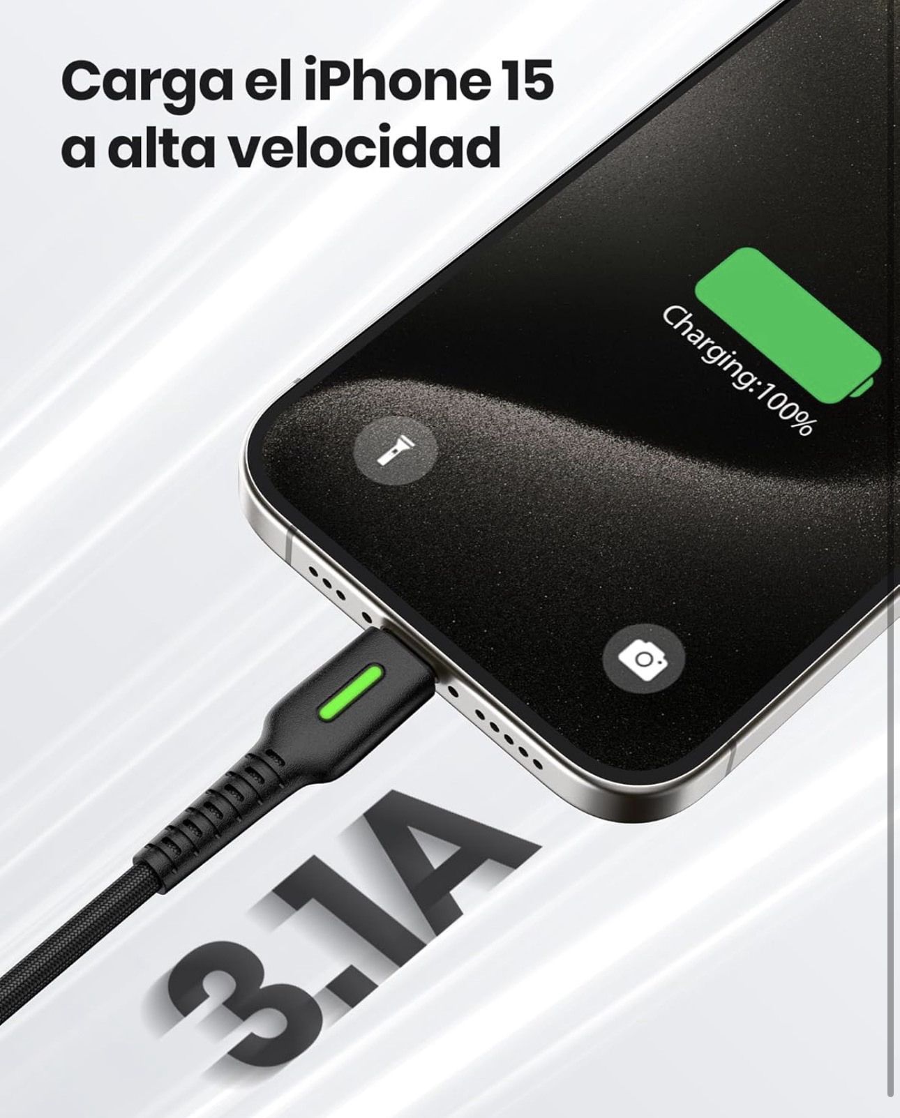Compatibilidad perfecta con el iPhone 15: Nuestro cable USB-A a USB-C premium garantiza una carga confiable para tu iPhone 15. Mantente siempre cargado y conectado sin compromisos. Nota: Este cable no admite la carga súper rápida para el iPhone más nuevo.
