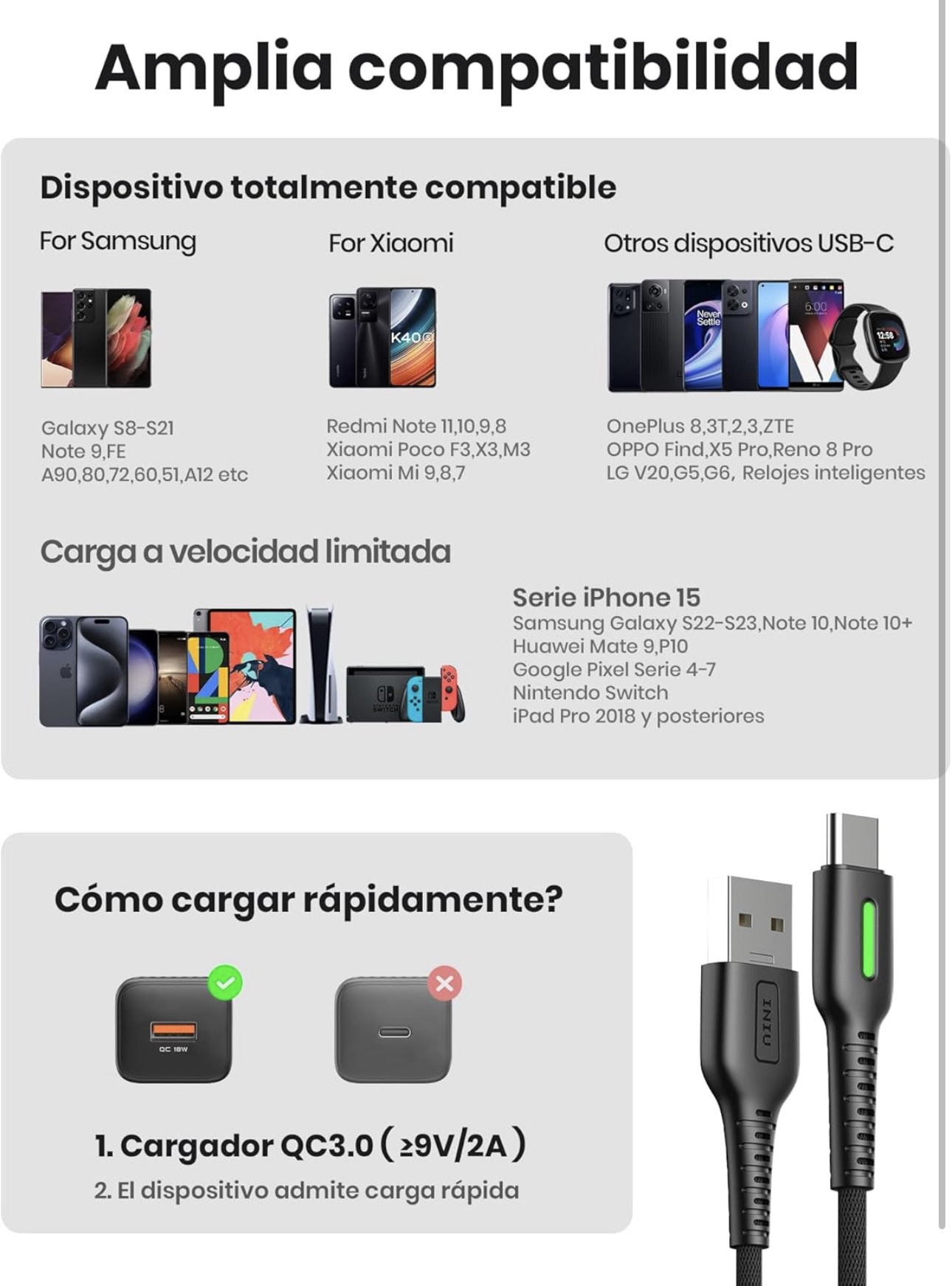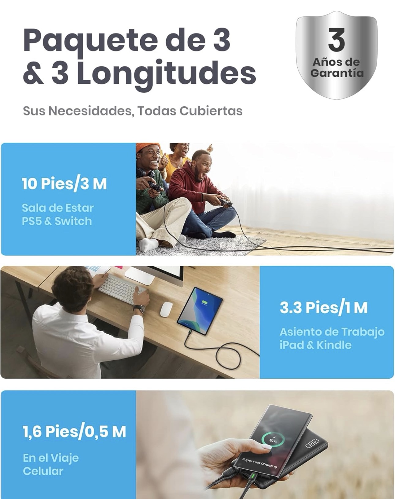Un paquete, 3 Cables de Carga Rápida: La solución real del cable de una parada, con dos de 2m y uno de 0,5 m, te preguntarás por qué necesita comprar otros cables adicionales. Compártalos con su familia o amigos o simplemente póngalos en cualquier lugar donde quiera cargar sus dispositivos. Van a satisfacer todas sus necesidades.