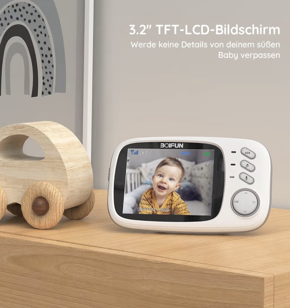 Pantalla HD】Nuestro vigilabebés con cámara con una pantalla LCD colorida de 3,2 pulgadas y una resolución de 320 x 240 píxeles le mostrará imágenes claras de su bebé. No te perderás ningún momento del crecimiento de tu hijo o hija. (La cámara solo funciona cuando está conectada a la fuente de alimentación. El monitor es inalámbrico.)