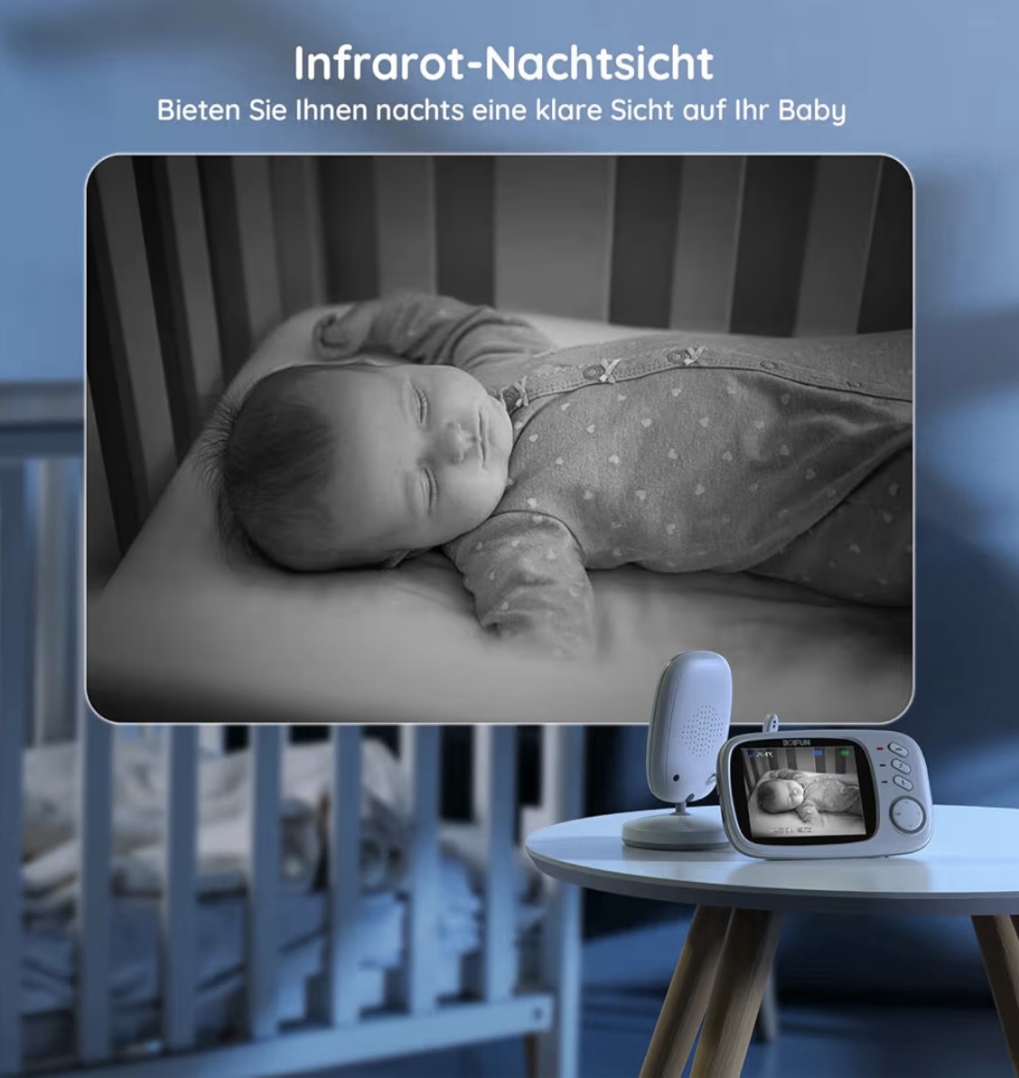 【Visión nocturna por infrarrojos】Con la visión nocturna infrarroja integrada de este monitor de bebé puedes controlar a tus hijos en la oscuridad, ya que la luz infrarroja que emite es muy débil y no te molesta, incluso puedes relajarte y evitar el miedo a la oscuridad.
